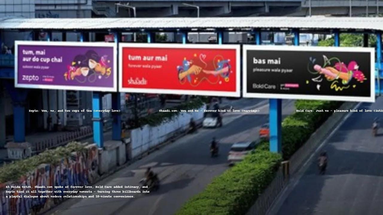 Zepto, Bold Care, and Shaadi.com are all different companies in India. This OOH structure made it feel like brands were “talking to each other” on the hoardings.