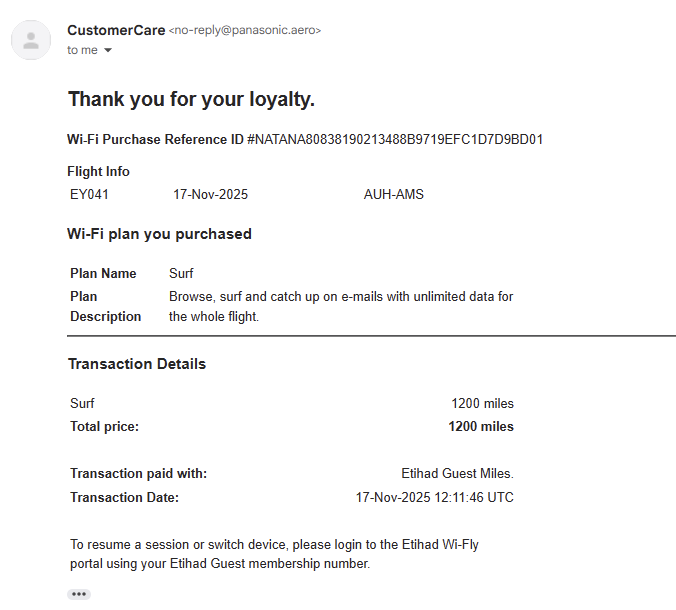 Just wanted to drop this here, as an example that there are always opportunities for improvement. The other week when I traveled from Bangkok to Amsterdam with Etihad, I purchased “on flight WiFi”. After purchasing you get an e-mail, it looks like this (warning!! Very, Very, Ugly non branded, seems like a standard supplier email (Panasonic)