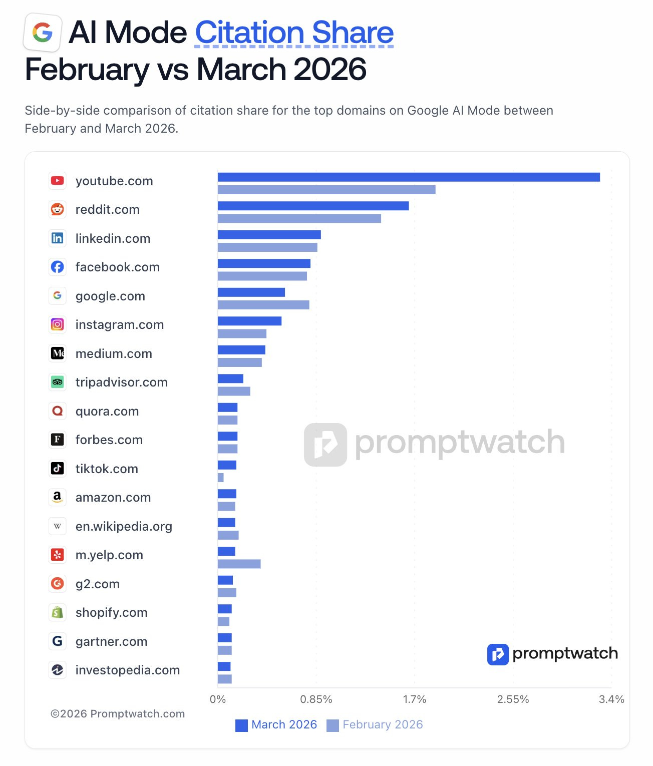 I have written about it many times before, make YouTube centric in your content strategy. Now this research from Promptwatch makes it even more clear. YT doubled in citations for Google’s AI mode. TikTok seems also to speed up.